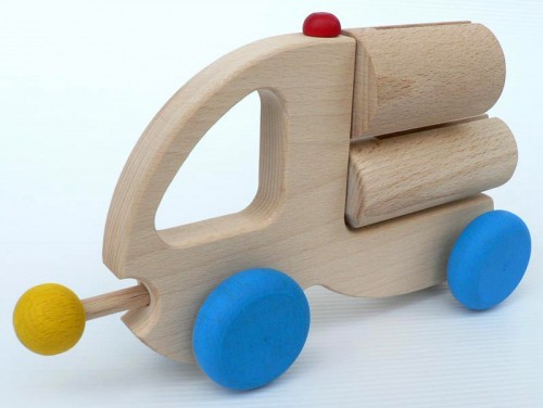 Dřevěný rytmický nástroj a hračka v podobě autíčka v jednom.